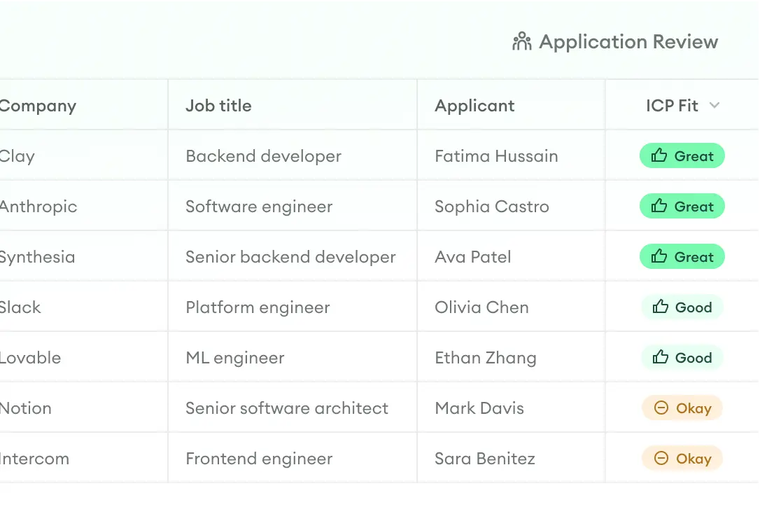 Every applicant is instantly categorized into ICP Fit buckets so your strongest candidates surface first, and the list re-evaluates every time you make updates to your ICP.